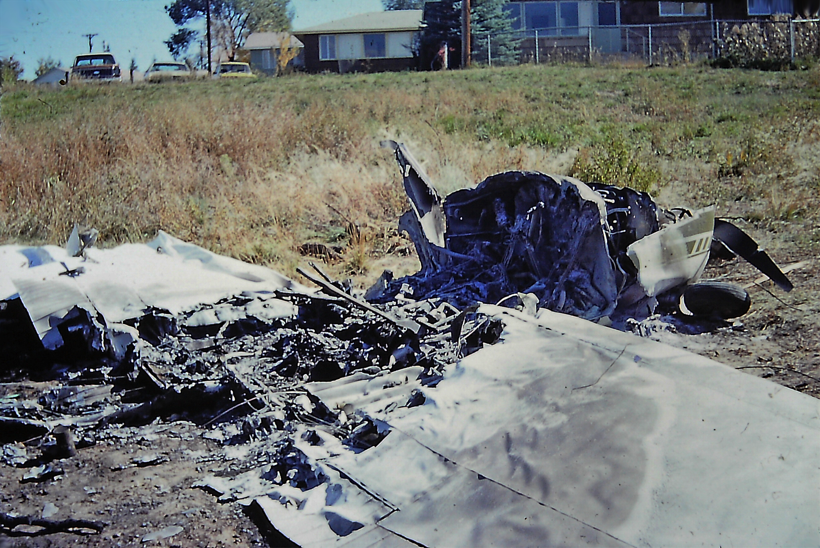 Another scene of wreckage Oct. 12, 1975 at Los Alamos County Airport, the day following the plane crash that hospitalized pilot Dick Malenfant. Photo by Bill Geer