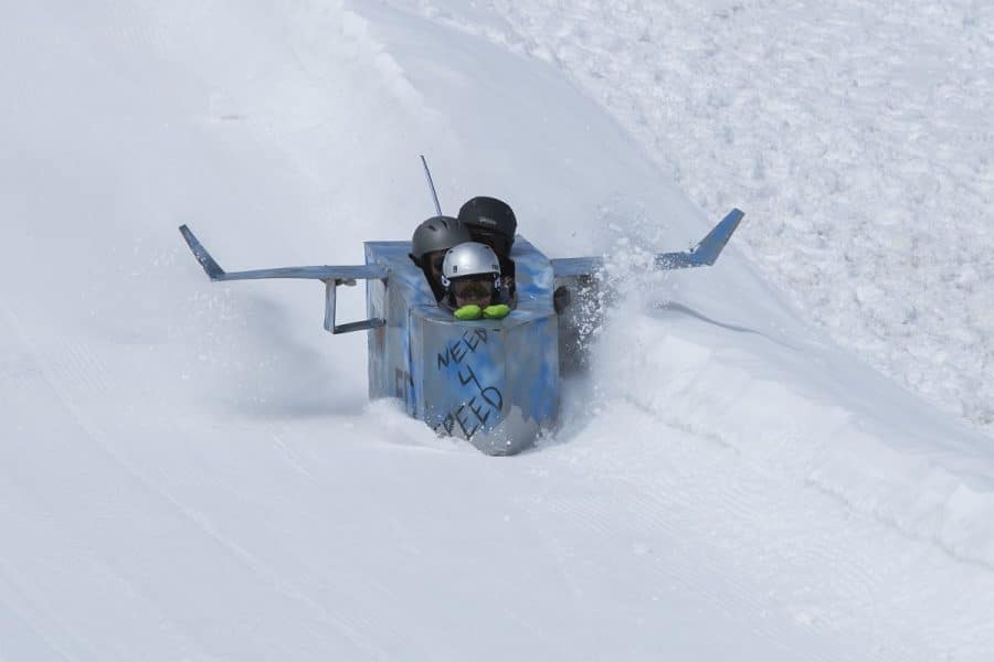 This is a derby, not a race. Derby racers will build their own sled ahead of time using cardboard and duct tape only. The objective is to successfully pilot your vessel down the hill with points awarded for distance, control and enthusiasm.