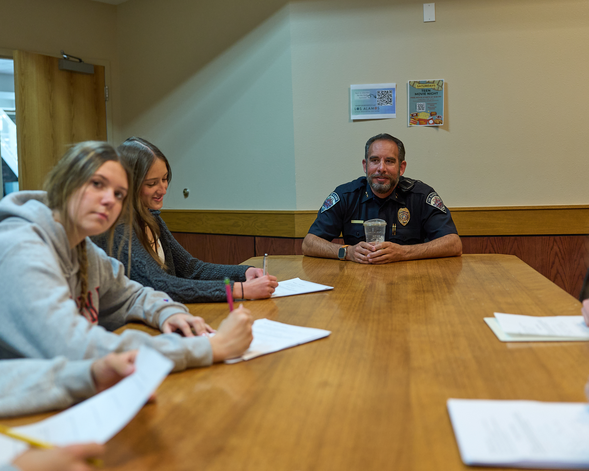 Los Alamos High School Students from English Teacher Lori Thompson’s Sports Lit class interview Los Alamos Police Sgt. Brent Hudspeth recently at the Justice Center. Photo by Nate Limback/ladailypost.com