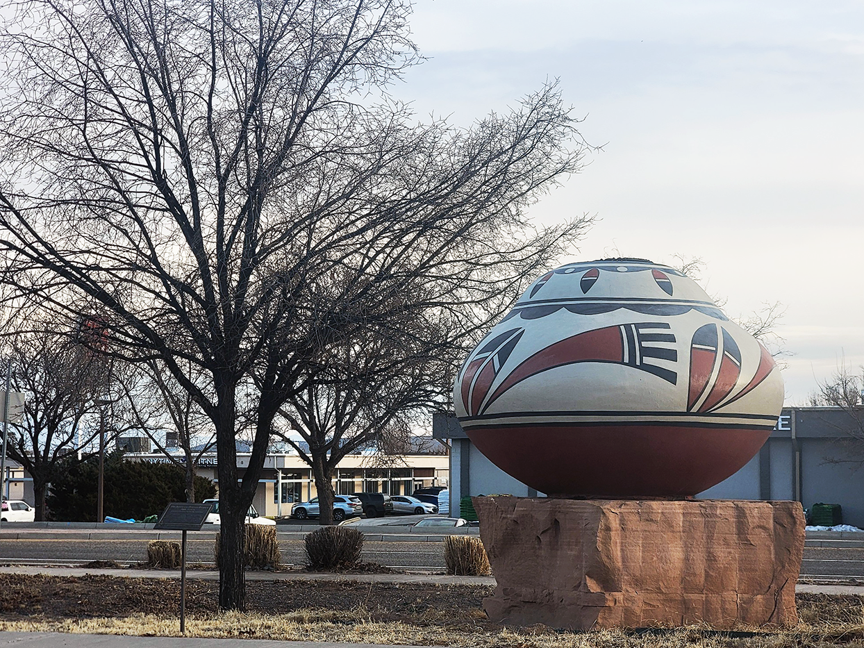 View on Friday of one of six large Native American pottery replicas placed along a half-mile stretch of the N.M. 4 corridor through White Rock. Proposed by the Los Alamos Art in Public Places Board and approved by the County Council, the pottery was installed in May of 2016. Photo by Carol A. Clark/ladailypost.com
