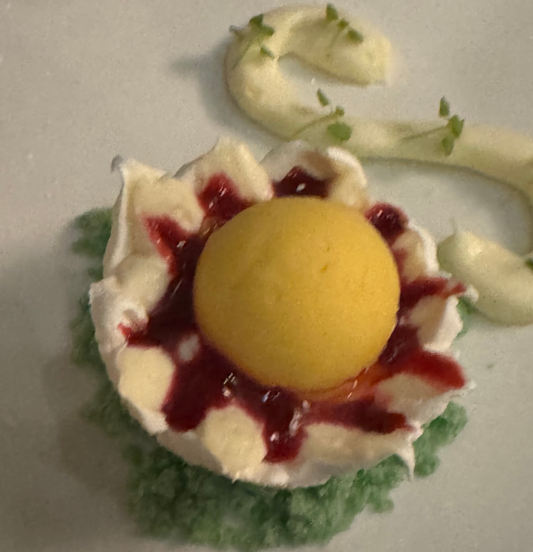 light rose water meringue filled with Chantilly cream, raspberry sauce, and passion fruit sorbet on a bed of almond crunch