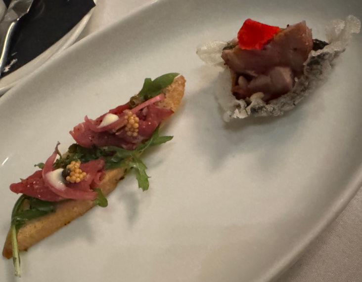We tried a special chef’s tasting menu, starting with a special amuse bouche of pancakes, creme fraiche and caviar. These were adorable and incredibly flavorful. Photo by Becky Rutherford