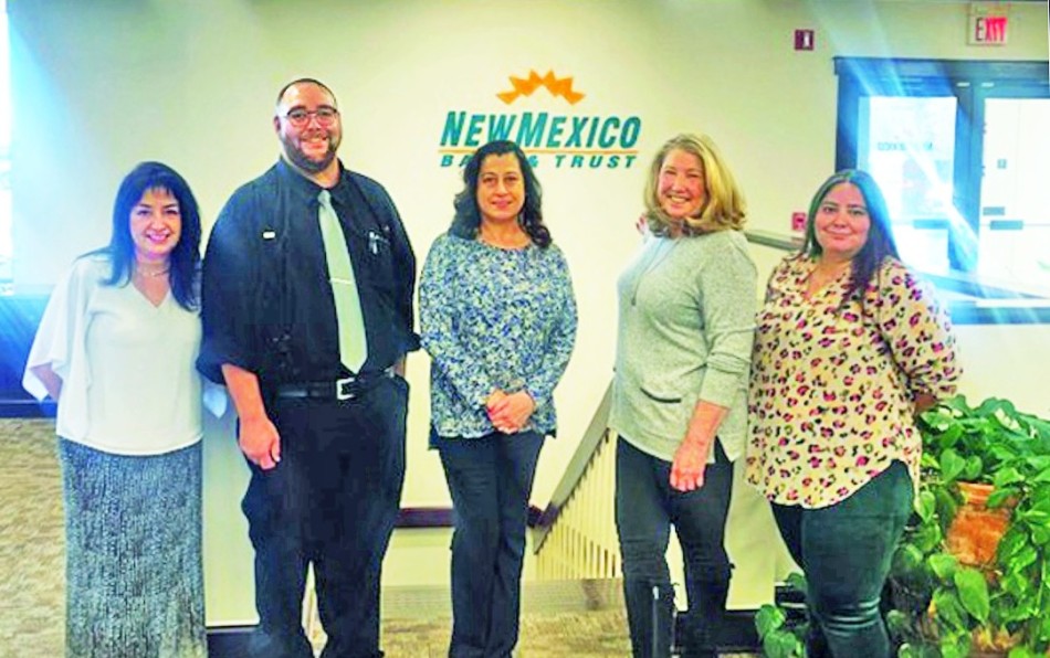 On the job in Los Alamos is the staff at New Mexico Bank & Trust offering friendly greetings to customers Friday at the Los Alamos branch at 15th and Central Avenue. From left, Sales Area Manager Jeannette Harmon, Onsite Manager Chad Carl, Universal Banker Celeste Abbott, Senior Personal Banker Pamela Mayfield and Universal Banker Valerie Martinez. Photo by Connor Hoch/ladailypost.com