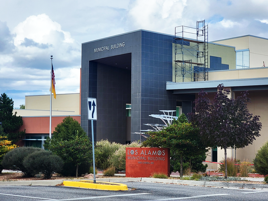 On the job in Los Alamos, workers set up scaffolding on the exterior of the Municipal Building Monday in preparation for repairing or replacing loose tile. Photo by Carol A. Clark/ladailypost.com
