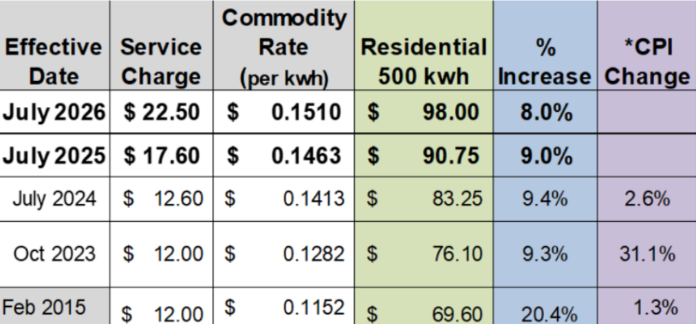 Chart indicating electric rate increases 2015-2025, created by Los Alamos County Utility. Courtesy/LAC