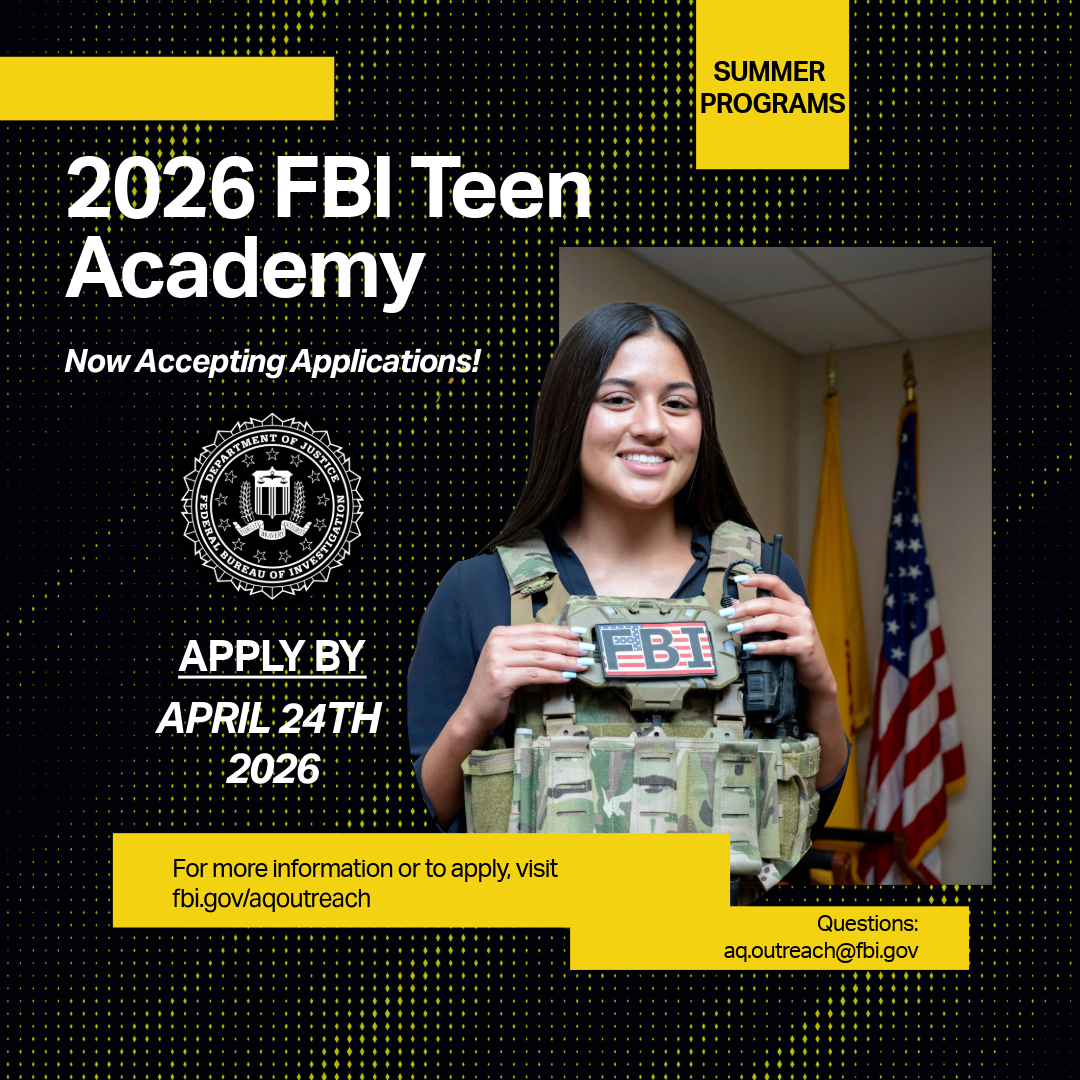 The FBI Teen Academy allows students who will be in high school during the 2026/2027 school year an opportunity to experience the inner workings of today’s FBI.