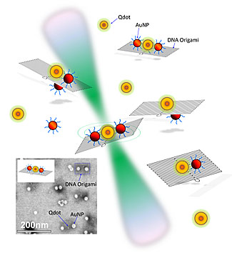 The NIST team explored the behavior of quantum dots and gold nanoparticles placed in different configurations on small rectangular constructs made of self-assembled DNA. Laser light (green) allowed the team to explore changes in the fluorescent lifetime of the quantum dots when close to gold particles of different sizes. Courtesy/NIST