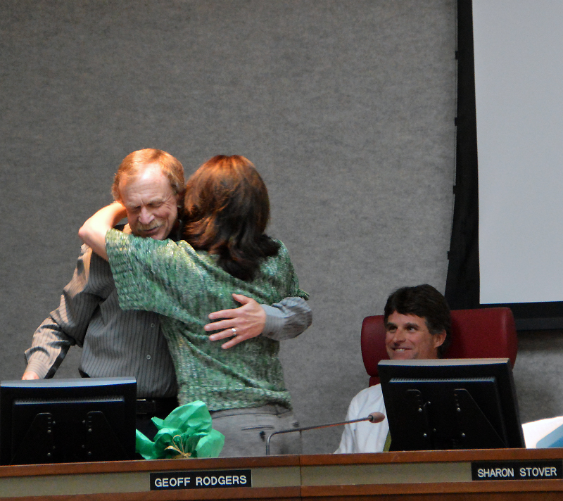 Los Alamos County Council Chair Sharon Stover embraces Councilor Mike Wismer in the final moments of their time together on Council during Tuesday night’s last Council meeting of the year. Stover, Wismer and Councilor Vincent Chiravalle officially leave office Dec. 31. Council Vice Chair Geoff Rodgers looks on at right. The remaining County Councilors and County Board and Commission members and Staff formally recognize the outgoning Councilors’ service and thanked them for their dedication to the community. During the meeting, Stover asked for a moment of silence for the Read More