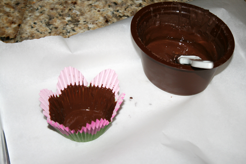 Melt chocolate according to directions. “Paint” a layer of chocolate on the inside of the paper cup. I used a little fancier cups, but plain ones work just as well.