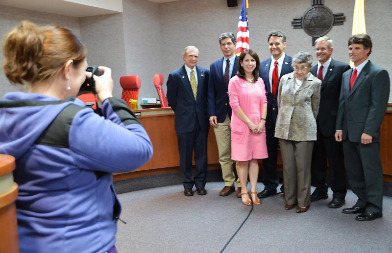 Los Alamos County photographer Leslie Bucklin takes the official portrait of the County Council Monday evening in Council Chambers following the resignation of Ron Selvage and appointment of Rick Reiss. From left, Councilors Michael Wismer and David Izraelevitz, Council Chair Sharon Stover, Councilors Vincent Chiravalle and Fran Berting, Councilor Rick Reiss and Council Vice Chair Geoff Rodgers. Photo by Carol A. Clark/ladailypost.com