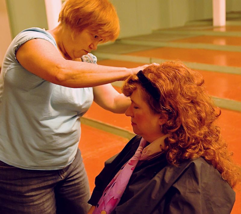 Director Gwen Lewis adjusts the headband of Jean Adkins who Read More