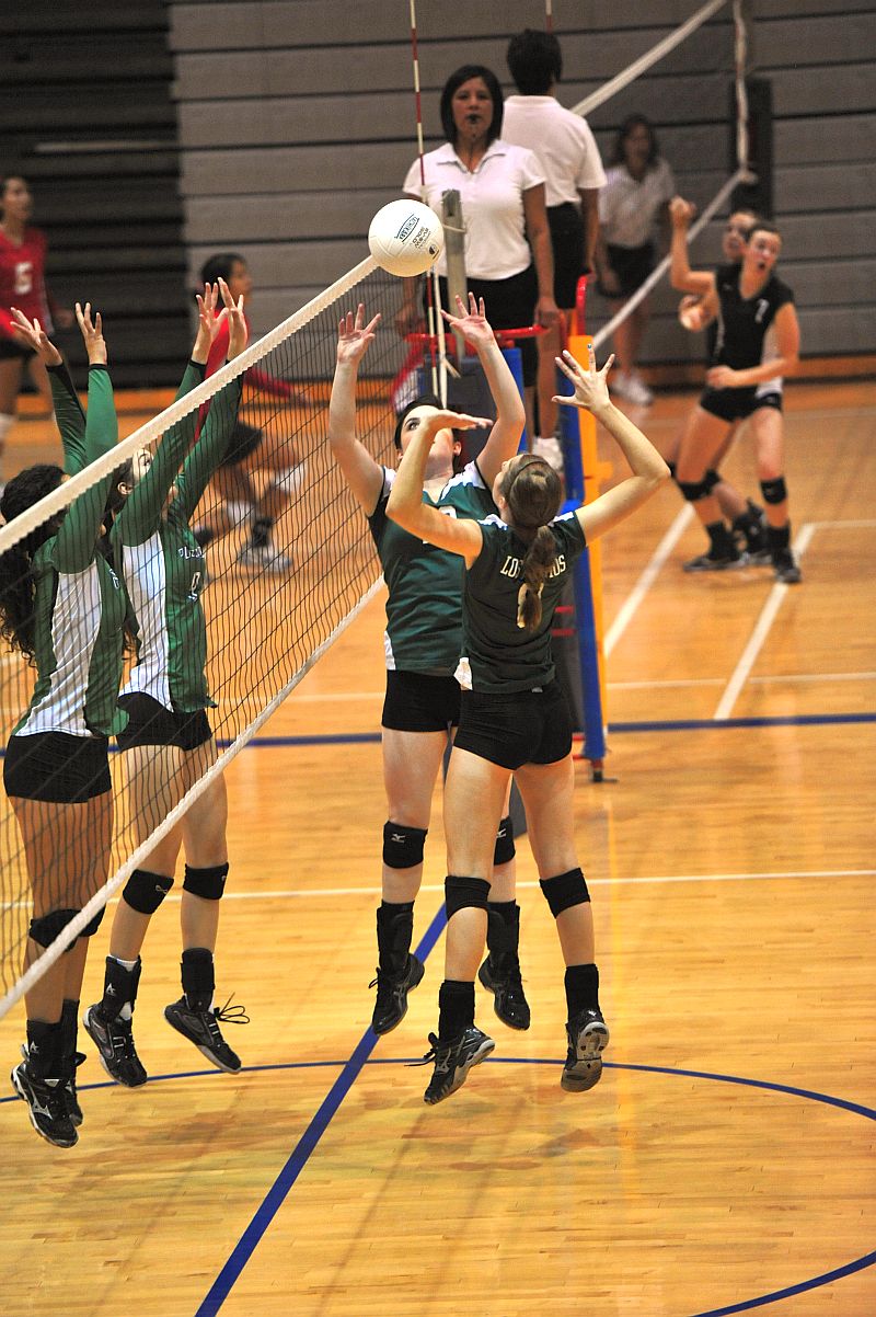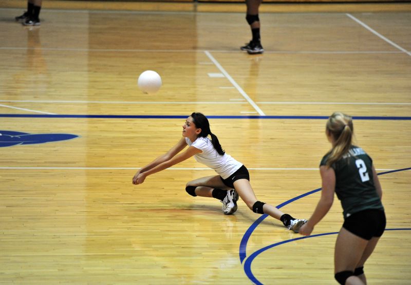 Los Alamos Hilltopper Danielle Ortiz on floor for dig. The Hilltoppers beat Pojoaque 3-0 Saturday in Piedra Vista tournament. Photo by Alan Kirk