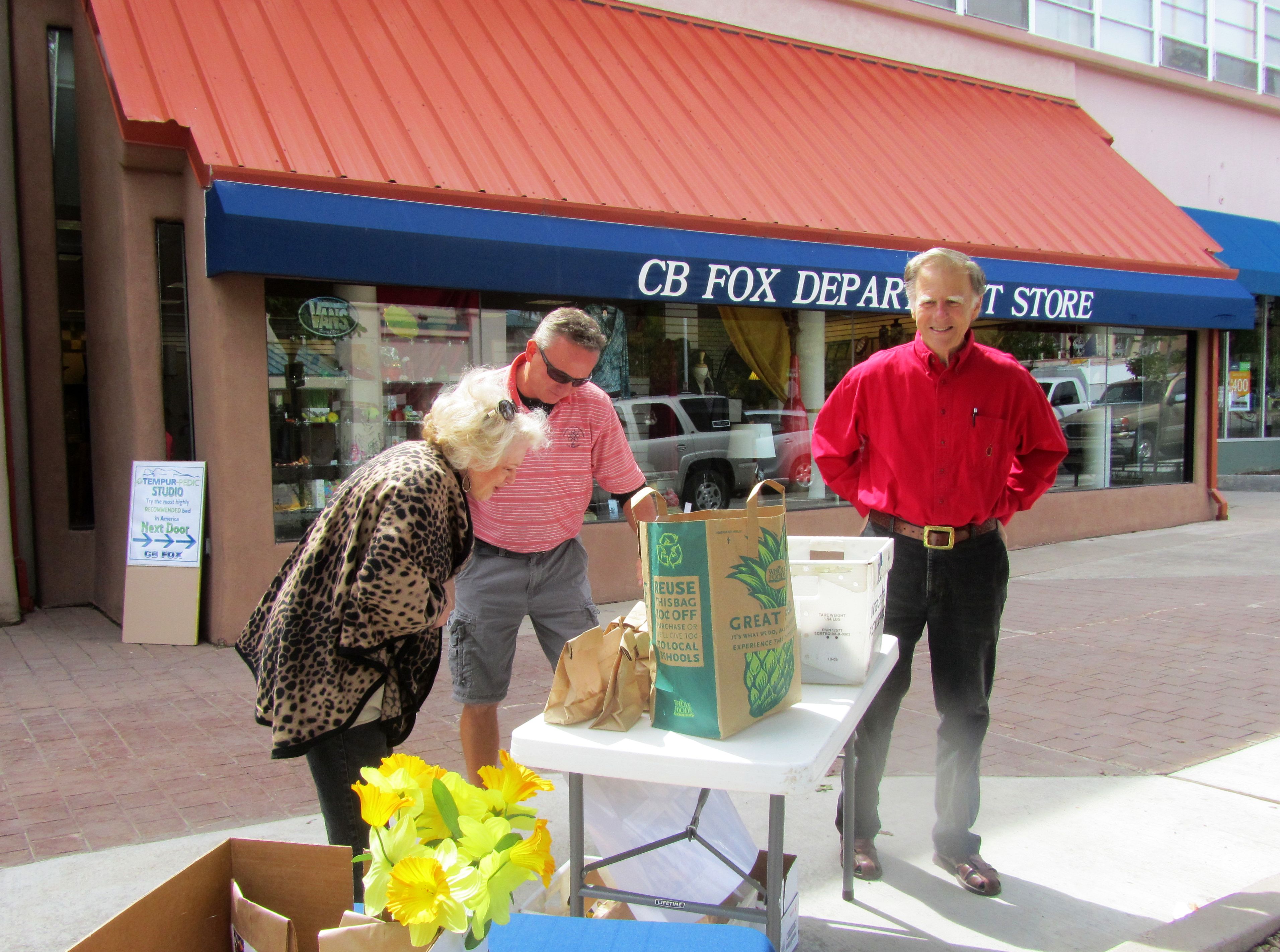 Brian Newnam, right, and Mike Lippiatt of the Rotary Club of Los Alamos volunteer at the Club’s annual bulb sale in front of CB FOX in downtown Los Alamos today. Proceeds from the bulb sale benefit educational efforts for youth. Contact the Rotary Club to purchase bulbs at 505-662-7950. Photo by Greg Kendall/ladailypost.com