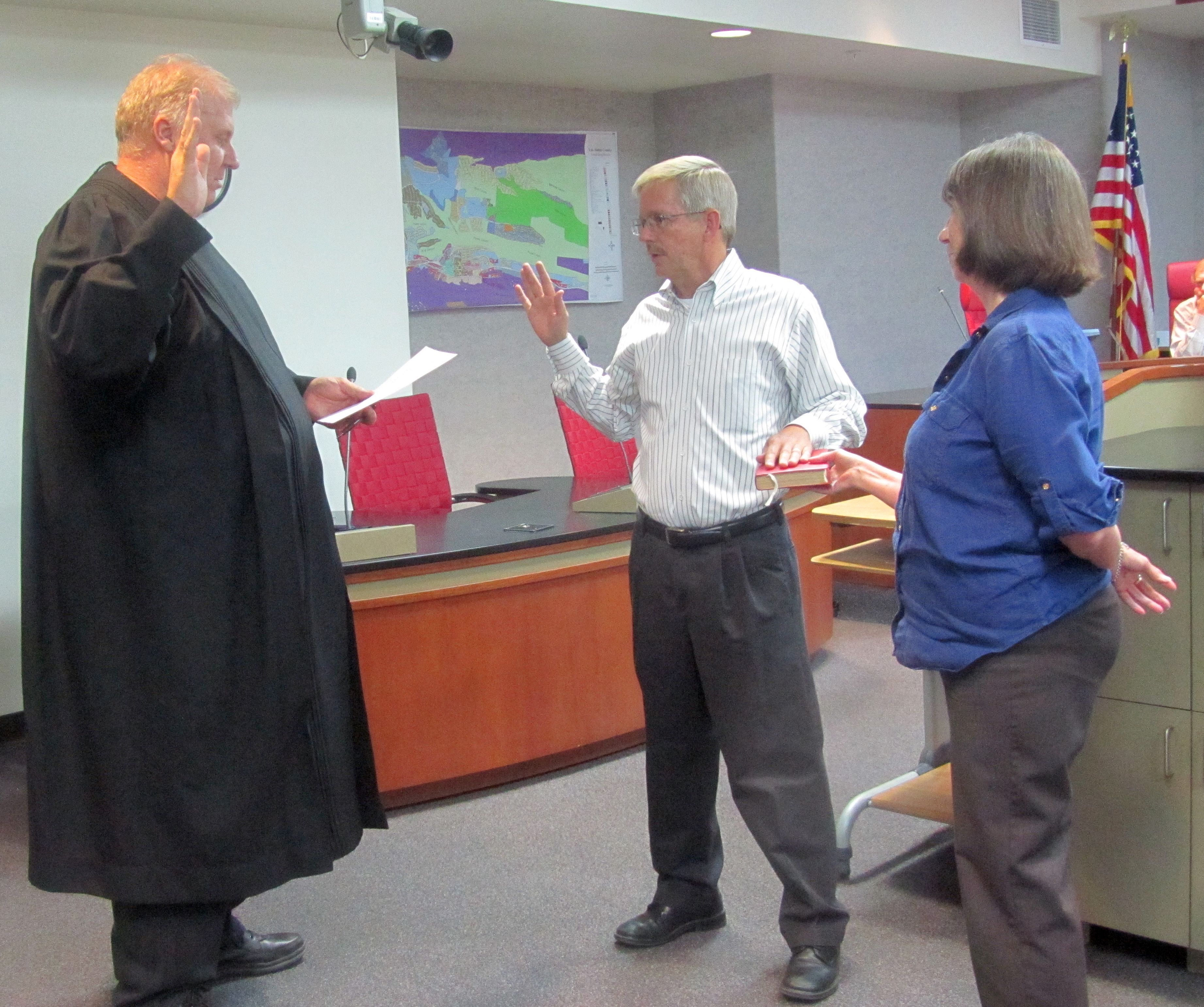 Los Alamos County Council voted to appoint Rick Reiss to fill the Council position left vacant with the resignation of Ron Selvage in August. Reiss will serve the remaining two years of the term. Municipal Court Judge Alan Kirk swears Reiss in. Photo by Carol A. Clark/ladaily post.com