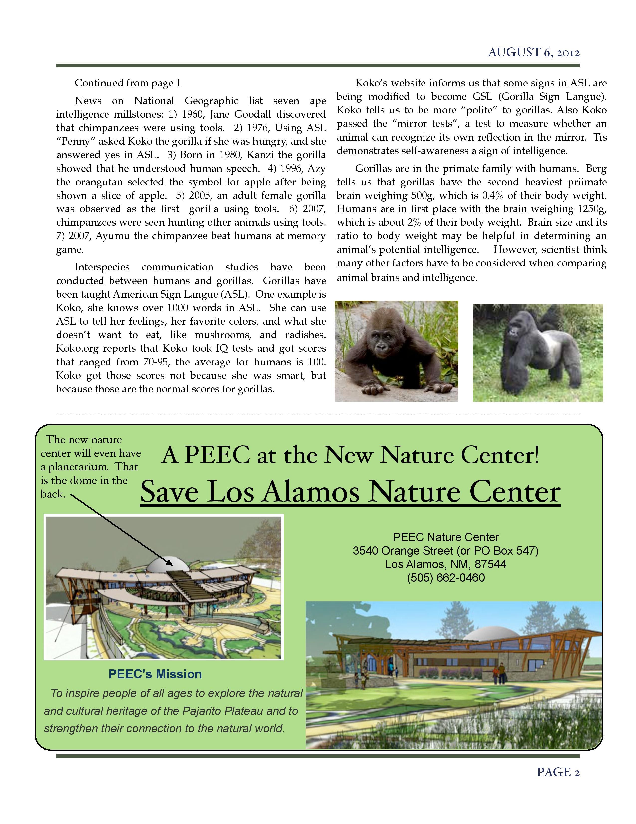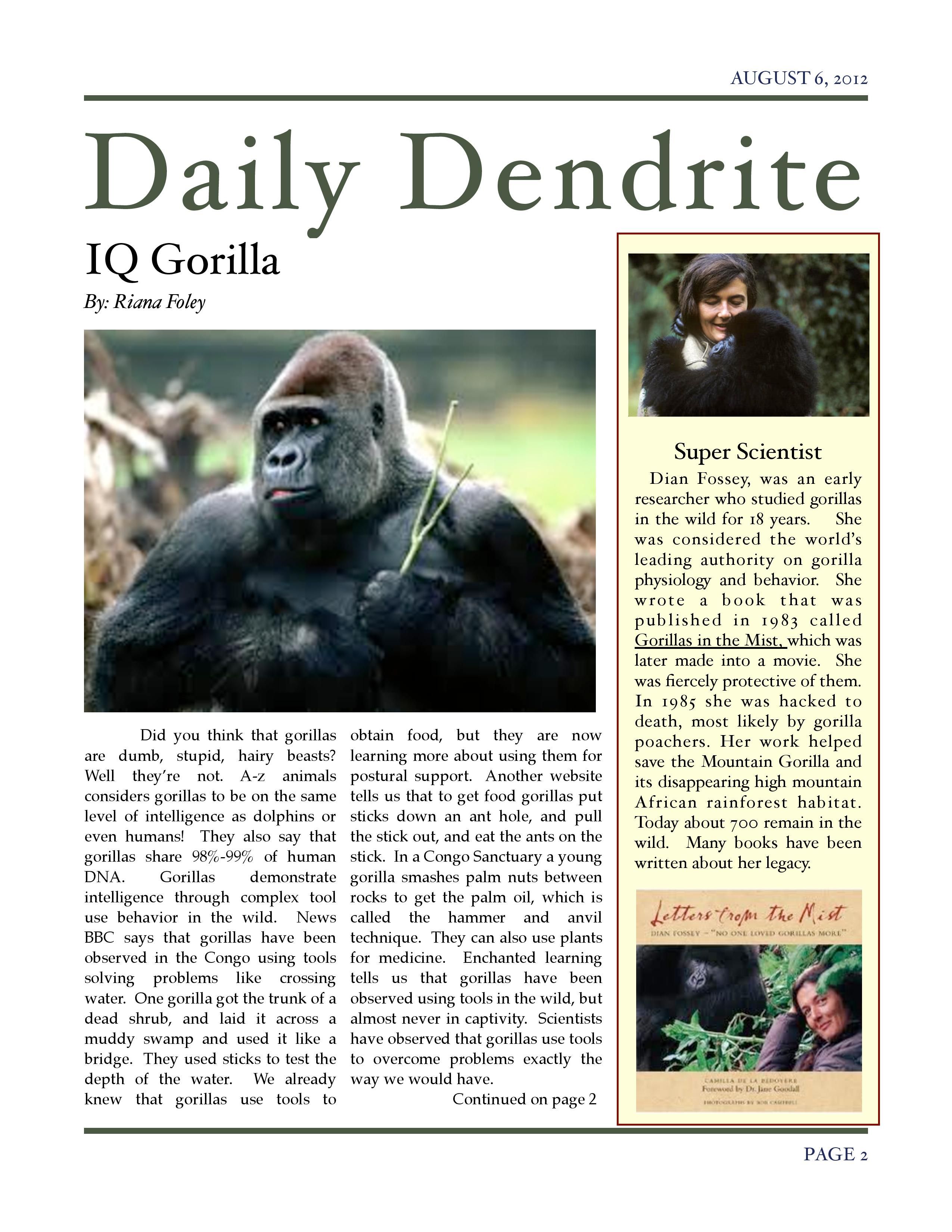 This newspaper features the intelligent attributes of the gorilla as reported and published by Mountain Elementary School 6th grade student Riana Foley.