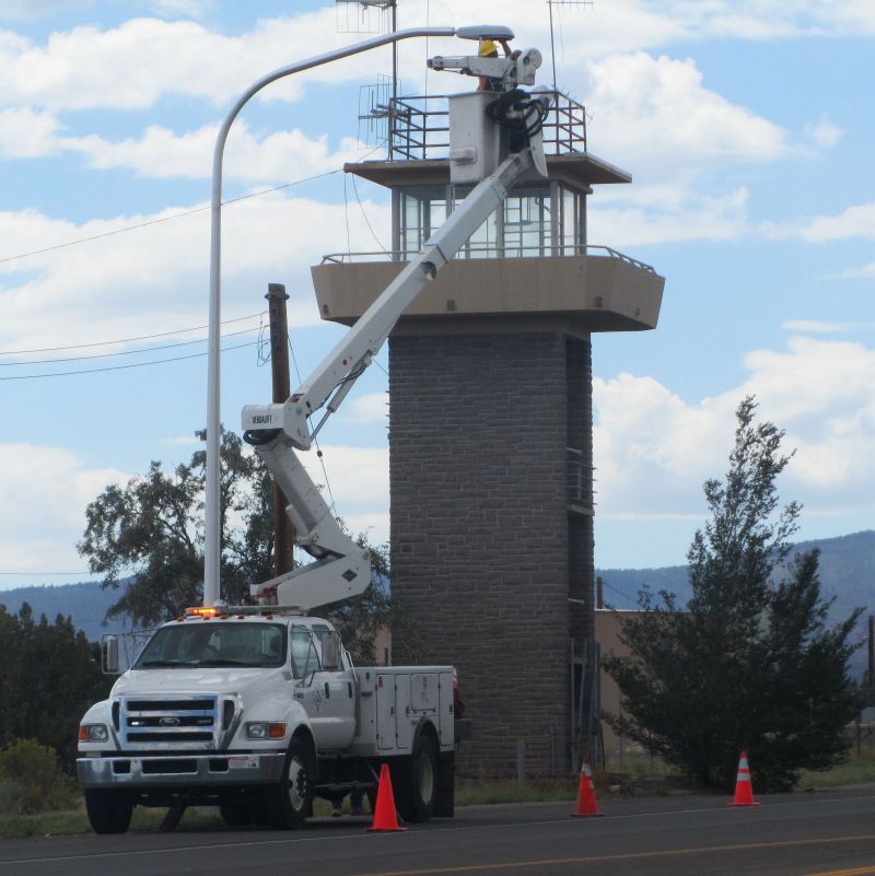 Crews work on a light pole next to the tower at the entrance to town Thursday. Photo by Carol A. Clark/ladailypost.com