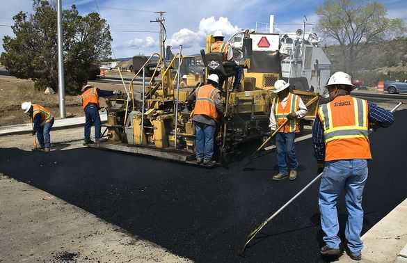 Workmen are still required in paving roads with these fancy machines. This crew mans the “lay-down” machine and assures an even thickness of the asphalt coating. The hot asphalt can melt the soles of the men’s boots if they stay in one pace to long. The N.M. 4 job will require two coats of material to form the finished roadway. Each coat appears to be about 2 to 3 inches thick. Photo by TK Thompson/ladailypost.com