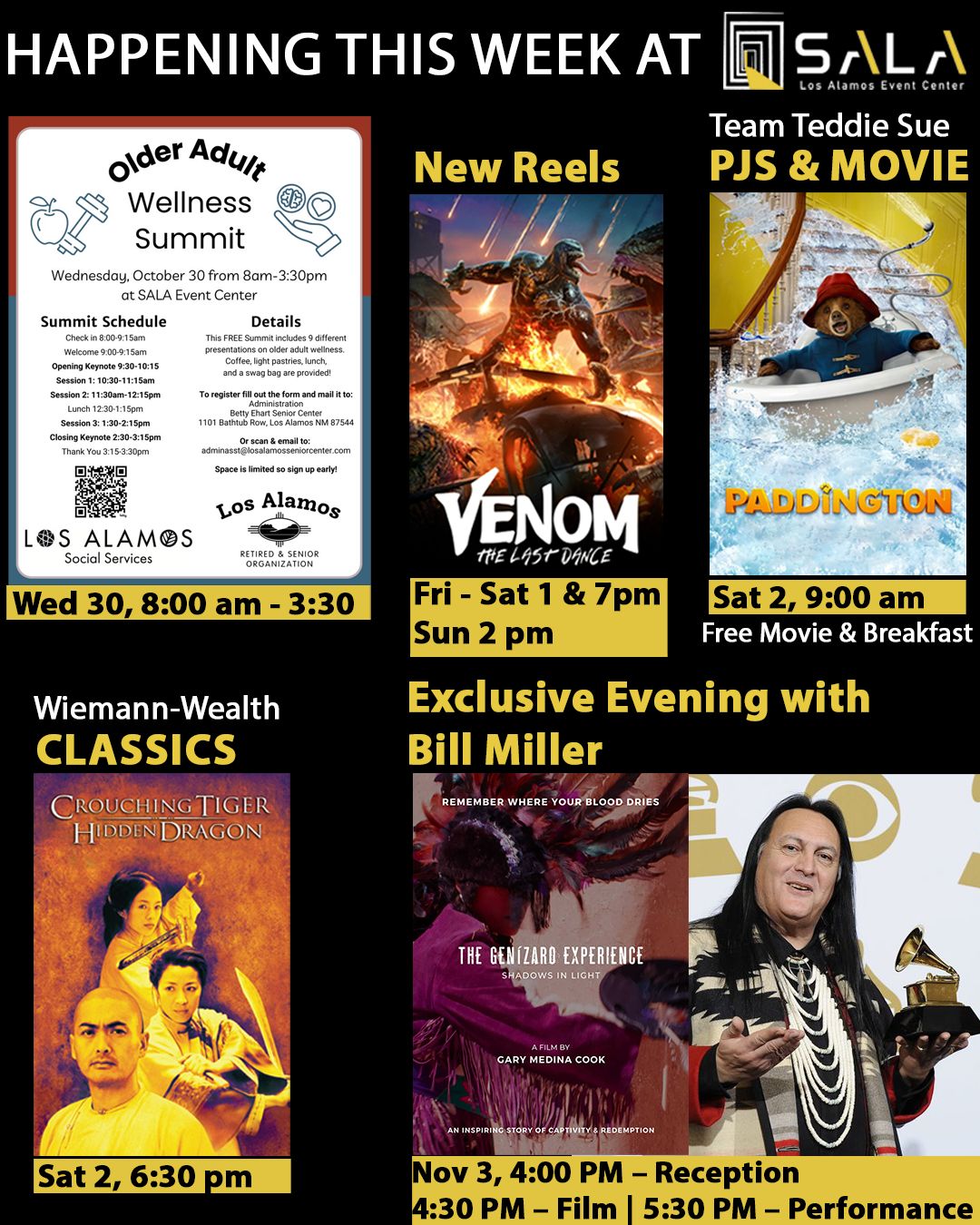 SALA Event Center announces a week of vibrant and engaging events designed for all ages, running through Nov. 3. This exciting lineup includes a wellness summit, family movie screenings, classic film presentations, and an exclusive live performance by Grammy Award-winning musician Bill Miller. Tickets are available online or at the SALA Event Center ticket office.