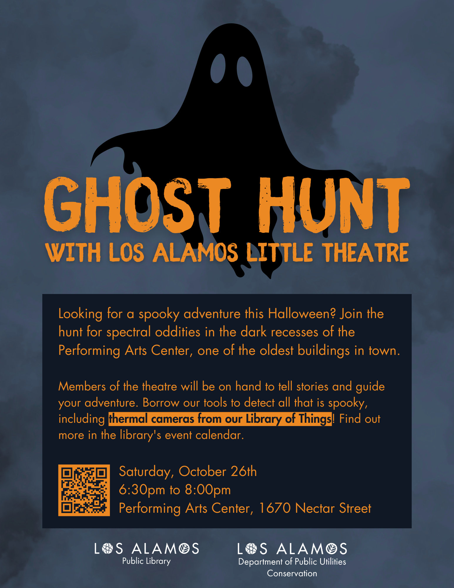 Saturday, Oct. 26, between 6:30 p.m. and 8 p.m., the Los Alamos Department of Public Utilities, the Los Alamos Public Library and Los Alamos Little Theatre will host a ghost hunt in the historic and spooky Performing Arts Center at 1670 Nectar St. This Halloween adventure returns once more after the successful adventures of last year’s ghost hunters.