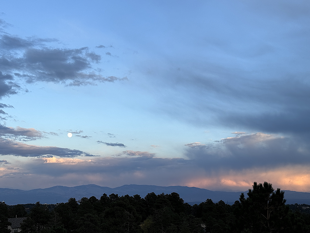 Moonrise and sunset color amid mixed weather over the Sangre de Cristo Mountains at 6:12 p.m. Tuesday with downtown Los Alamos visible in the bottom right corner. Photo by DW Decker Read More