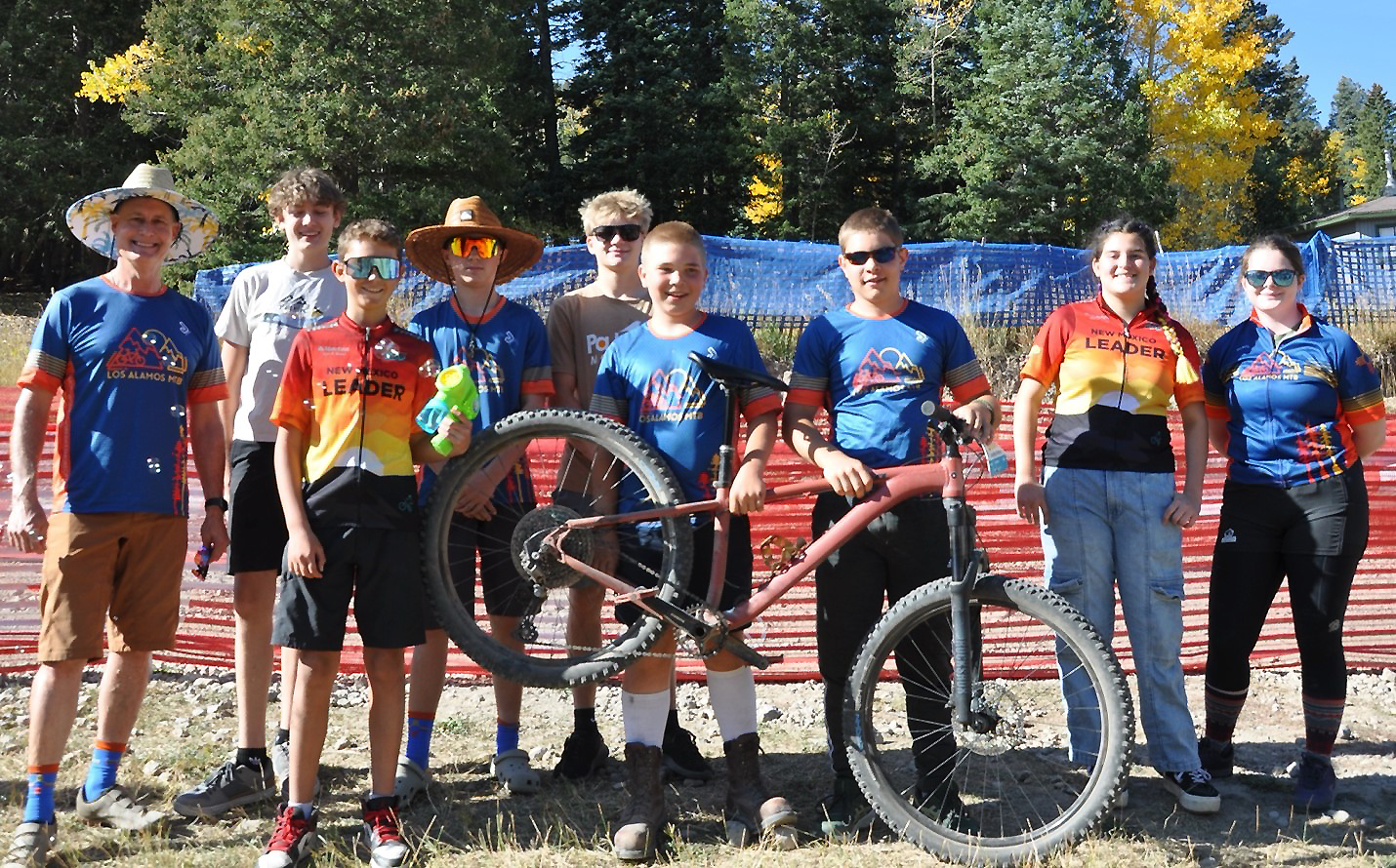 Los Alamos Mountain Bike team before the Pedal Pajarito race on Sunday, from left, Jim Tyldesley, Calvin Grow, Quanah Moseley, Ian McLean, Sebastian Koglin, Jonathan Wehner, Matthew Wehner, Hannah Waldschmidt and Natalie Crawford. Courtesy photo
