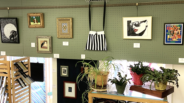 Some of the more than 30 diverse pieces in Village Arts’ new exhibit, ‘Ebony and Ivory’ that explore the attraction of seeming opposites. Courtesy photo