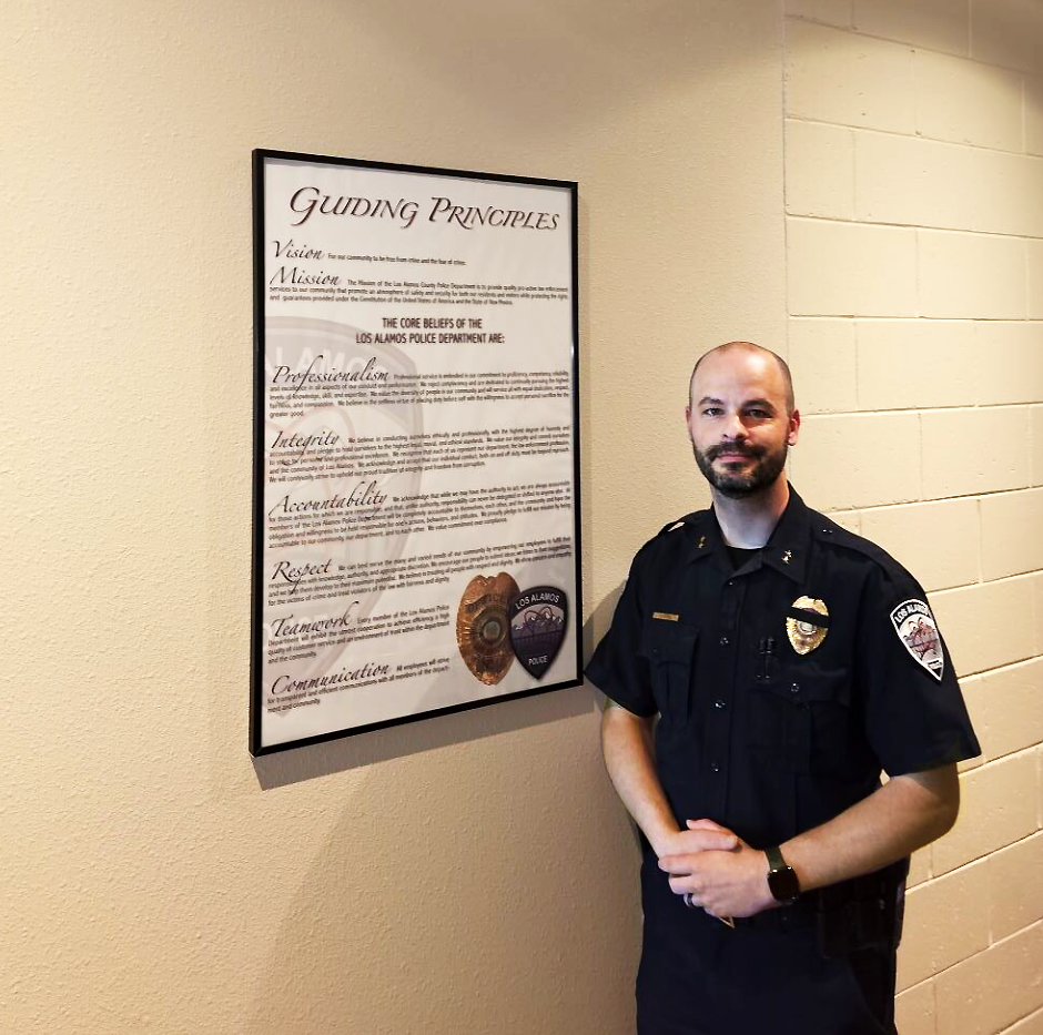 On the job in Los Alamos is Police Cmdr. Daniel Roberts standing near the department’s Guiding Principles poster Thursday inside the station at 2500 Trinity Drive. Cmdr. Roberts began his career at LAPD in 2010 and now oversees police operations including four patrol units, the investigations section, social media, the FTO program and recruiting. Photo by Andy McBride/ladailypost.com Read More