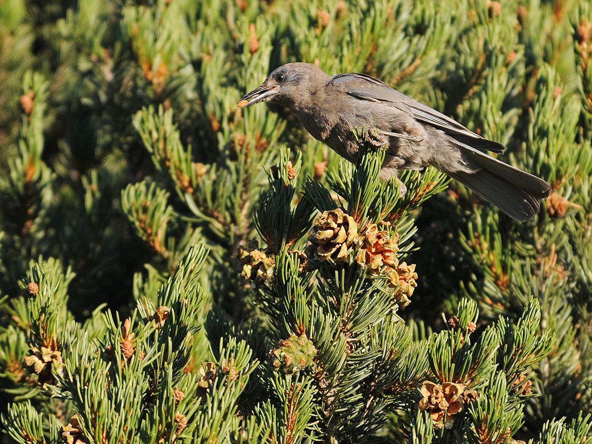 A Pinyon Jay perches on a pine tree branch at Bandelier. Photo by Sally King