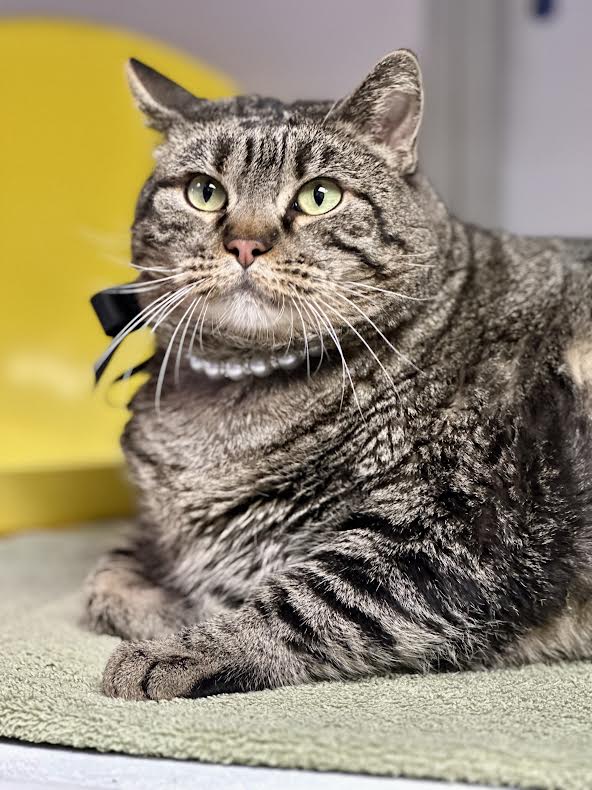 Phoebe is in her renaissance era—and she’s doing it in pearls. At 8 years old, this brown tabby came to us as an owner surrender, carrying a whopping 26.6 pounds and facing some skin issues.