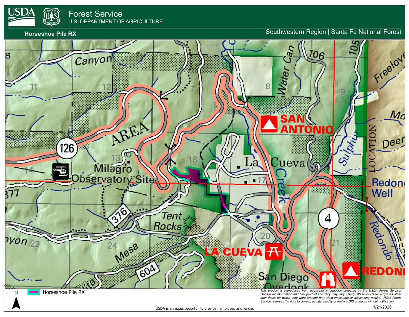 SANTA FE — Santa Fe National Forest is planning prescribed fire operations as early as Monday Jan. 26 in the Jemez Ranger District, pending all required approvals. The 239-acre Horseshoe Piles Project is located adjacent to the Horseshoe Springs community near La Cueva and north of the village of Jemez Springs, N.M. Ignitions are planned for one to four days.