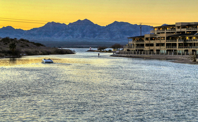 Lake Havasu: The setting sun lighting the sky and reflecting the waters of Lake Havasu. This is a view of boaters and a paddle boarder on the canal which was dredged out to create a setting for the London Bridge in the 1970s. The waters open up at the end of the inlet to the open lake waters. Photo by Gary Warren/ladailypost.com