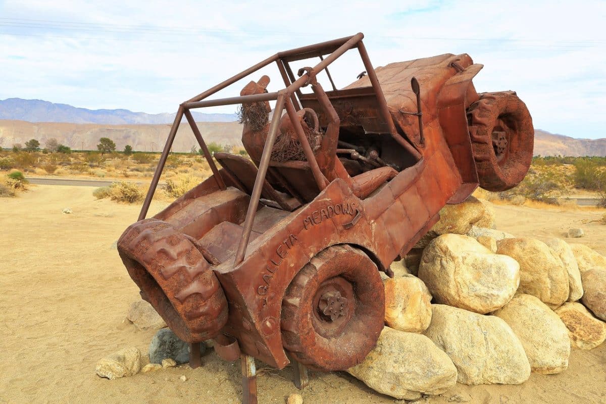 Jeep: A Willys Jeep sculpture complete with a driver and a passenger appear to be climbing rocky terrain in Borrego Springs, California. The Jeep is the actual size of a Willys Jeep and the passengers are life size as well. Photo by Gary Warren/ladailypost.com