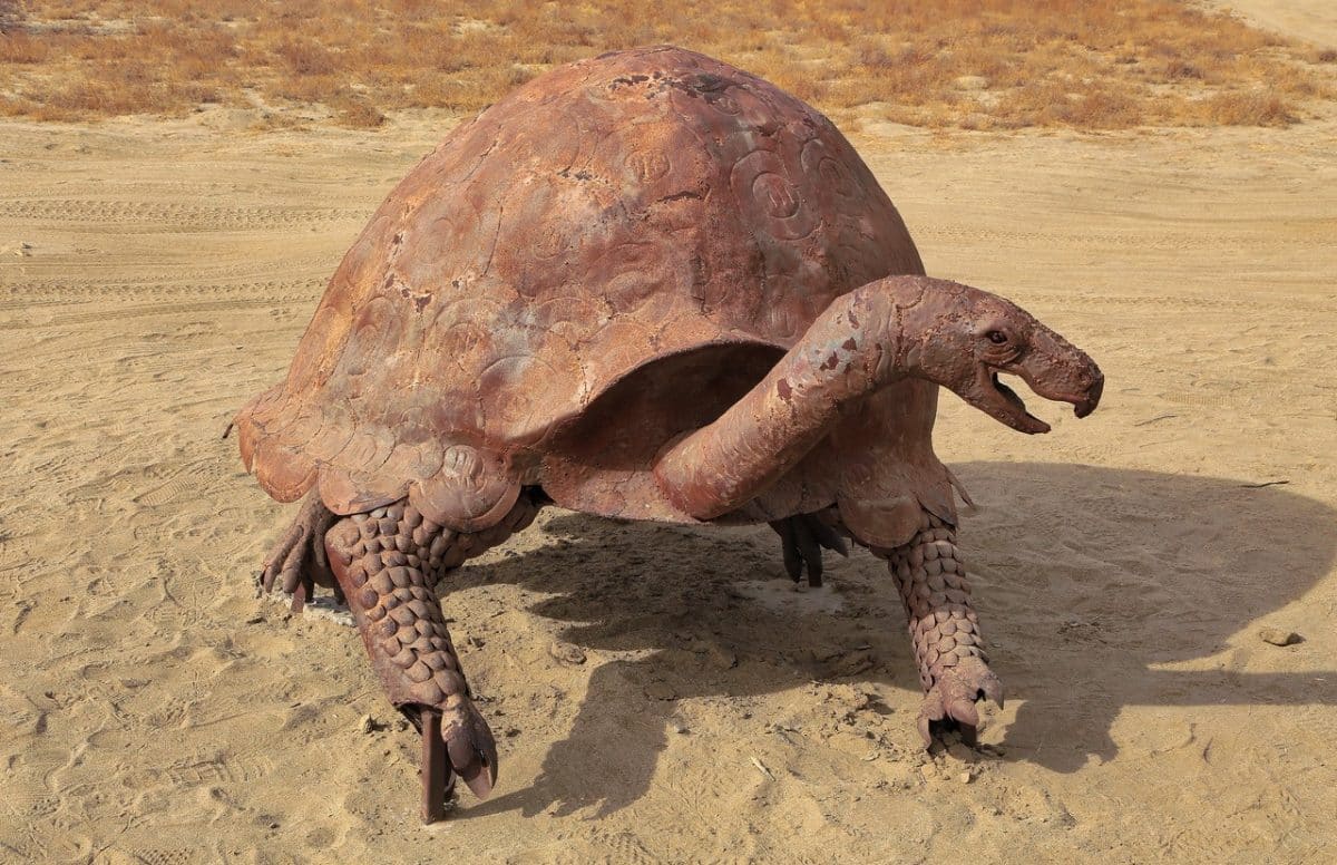 Tortoise: A desert tortoise sculpture appears to be conversing with another tortoise to his left. The sculptures scattered about in Galleta Meadows began with the dinosaurs and other creatures that once roamed this desert. Later, Breceda began adding sculptures of other contemporary animals, items and people that represent local history, as well as some whimsical and fantasy creatures. Photo by Gary Warren/ladailypost.com