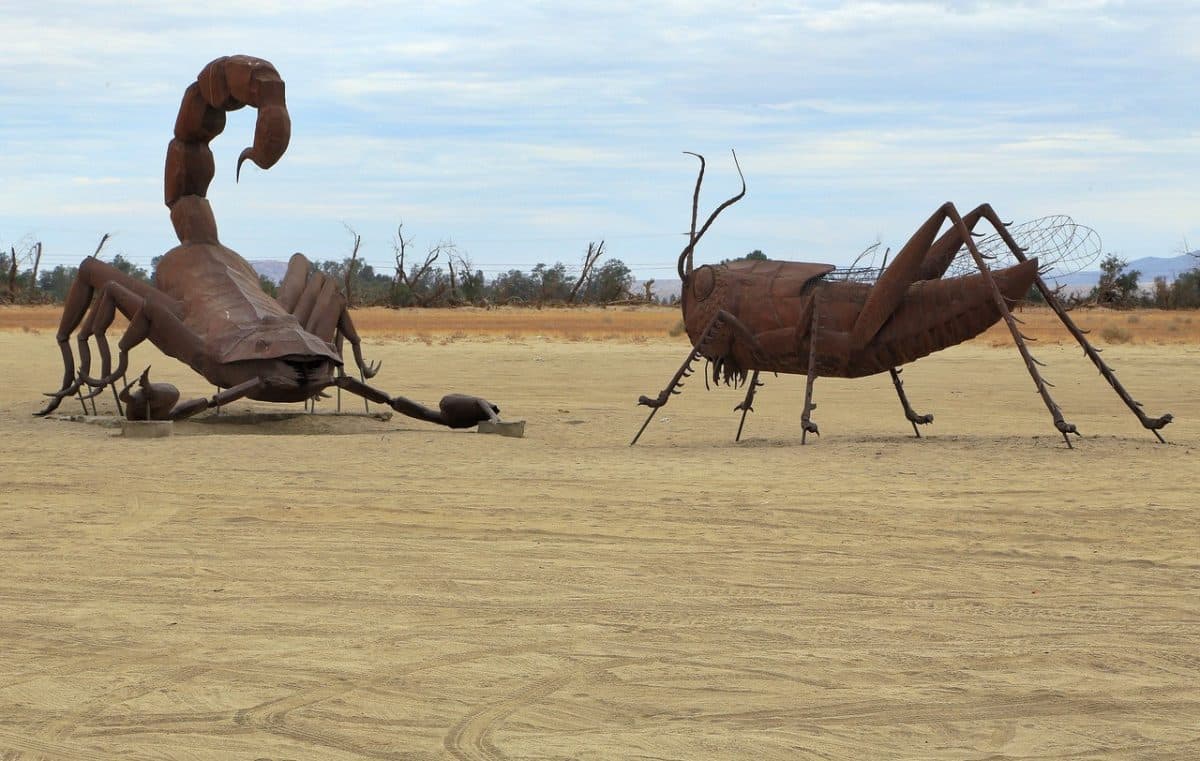 Scorpion and Grasshopper: The scorpion appears ready to jump on the grasshopper in this two piece sculpture in Borrego Springs. Galleta Meadows is open desert and is open to the public at no charge any time of the day or night. Photo by Gary Warren/ladailypost.com