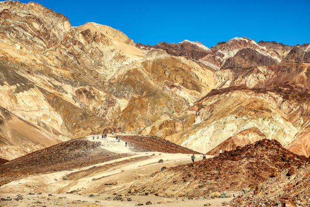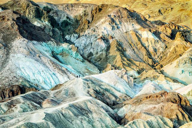 Artists Palette: Artists Palette is the star viewpoint on the nine mile Artists Drive area of Death Valley National Park. This view features some of the most colorful rock formations within the national park. The formations are a result of volcanic activity millions of years ago and the array of colors are caused by oxidation of the various minerals found in the rocks. A scale of the scene is seen by two groups of visitors who are located near the center of the photo who were getting a closer view of the rock formations and colors in the area from a ridge line of white rock. Photo by Gary Warren/ladailypost.com