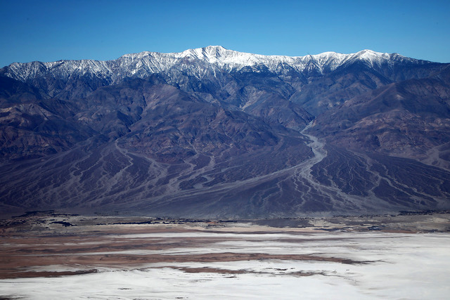 Death Valley & Telescope Peak: A view from Dantes View reveal the vast overall view of the southern end of Death Valley National Park. Telescope Peak, elevation 11,049′, is in the Panamint Mountain Range in the western part of the park and is the highest point in Death Valley. Dantes View, elevation 5,475′, is in the Amargosa Mountain Range. The massive Death Valley separates the two ranges. The basin of the valley is covered with hundreds of square miles of salt flats especially in this end of the valley. Photo by Gary Warren/ladailypost.com