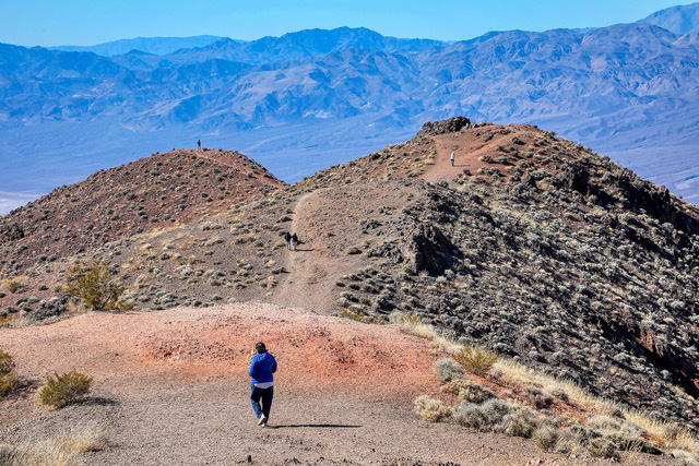 A Closer View: About a mile into Artists Drive is the first viewpoint in the area. Seen are several hikers as they make their way to a nearby ridge to get a closer view of the canyon and mountainside in the scene. This image was taken earlier as the colors began to glow. Just a few minutes later the colors in the scene were more similar to those seen in the Last Light photo above. Photo by Gary Warren/ladailypost.com