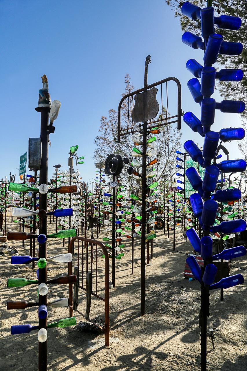 Forest: When one arrives at Elmer’s Bottle Tree Ranch in Oro Grande, Calif. the sights and sounds can be overwhelming. The colors of the bottles shining in the desert sun and the tingling of the bottles against the trees soon sink in as you survey more than two acres of bottle trees tightly planted around the area. Photo by Gary Warren/ladailypost.com