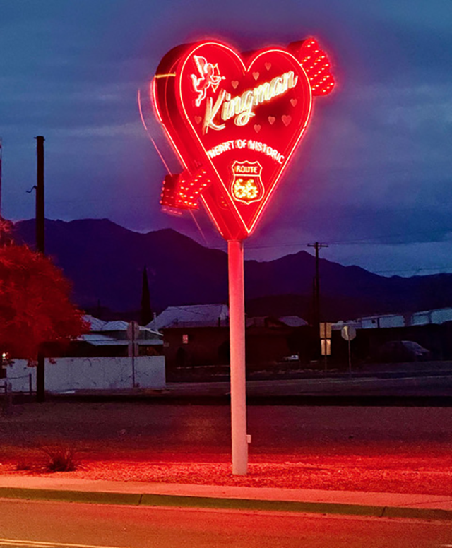 Heart of Route 66: A newly added neon sign along Route 66 in Kingman reads ‘Kingman Heart of Historic Route 66’. The bright neon lights shine on the ground around the sign, lighting the space in red. Photo by Gary Warren/ladailypost.com