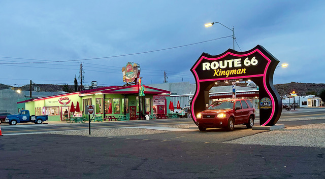 Kingman Drive-Through: A neon-lit drive-through Route 66 shield stands near the Kingman Visitors Center and Arizona Route 66 Museum. The shield was added to the center in 2021 and is a very popular attraction. When passing by the sign, there is almost always a car under the sign with travelers taking photographs of their car at the sign. Many evenings cars wait in line to drive around and through the shield. Seen across the street is the famous Mr. D’s Route 66 Diner, which is probably the most popular restaurant along the route in Kingman. Photo by Gary Warren/ladailypost.com