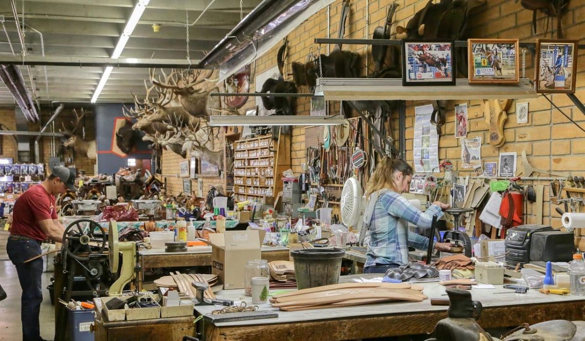 Exiting through a back door and across the alley was a building which housed the saddle and rope shop. To the side of that building was a door that led into the museum. The quantity and quality of the inventory in each building left us speechless. Hundreds of ropes lined the isles while dozens of saddles sat on saddle racks to the side of the space. The ropes and saddles were all made on site by King Saddlery craftsmen. Located just beyond the saddles was a shop area where leather workers worked around a few shop tables working on leather belts and another woman sat a sewing machine repairing a leather jacket.
