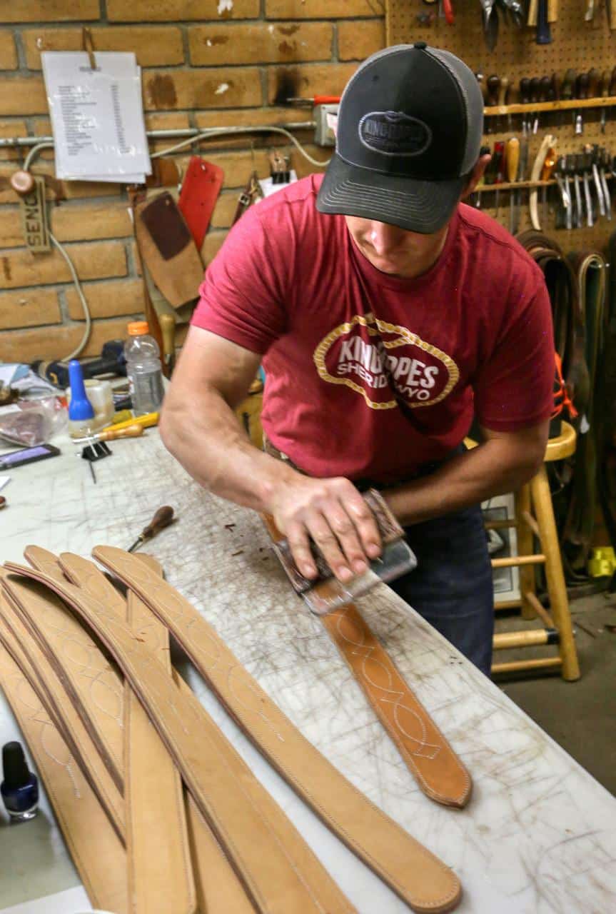 Quality: A detail shot of a saddle illustrates the quality and beauty of the saddles produced at King’s Saddlery. The detail stamping pattern of the flower design is a part of the Sheridan Style saddle made famous by original owner Don King. Photo by Gary Warren/ladailypost.com
