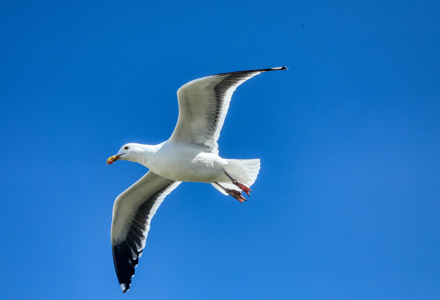 Snack Time: The birds were flying in groups and occasionally one would dart toward the ocean water and come up with a snack. This bird carried his snack a little farther away before consuming the catch and coming back for more. Photo by Gary Warren/ladailypost.com