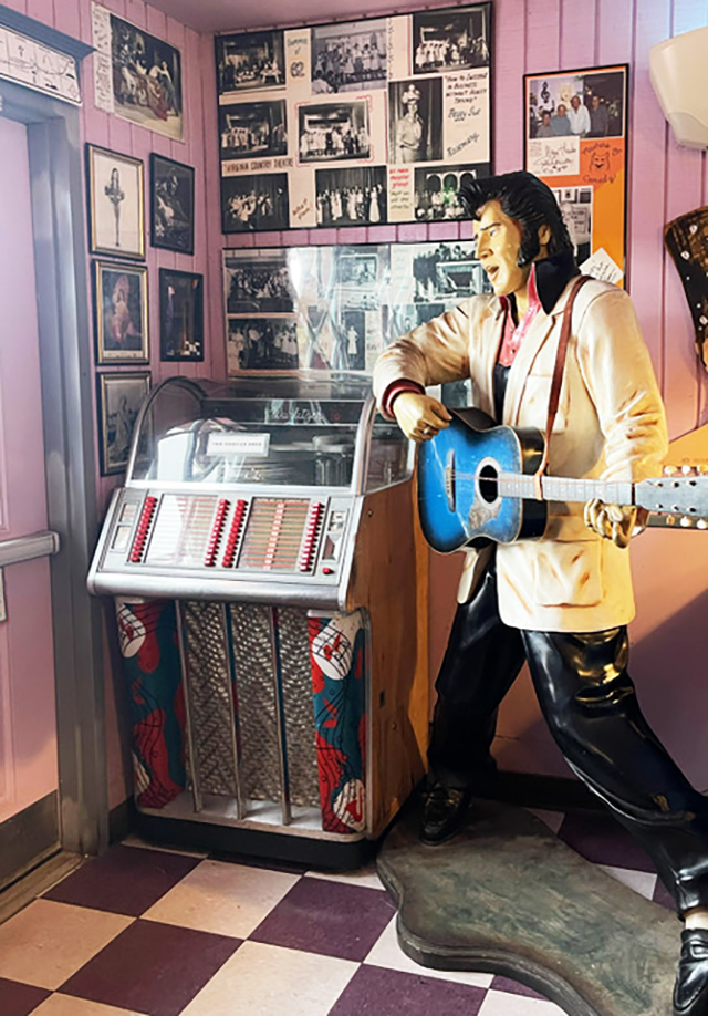 Elvis: A life-size sculpture of Elvis and a 50s era jukebox attract attention in a corner of one of the diner’s rooms. The fun also spills out into the shaded eating area featuring large metal sculptures of several dinosaurs. Photo by Gary Warren/ladailypost.com