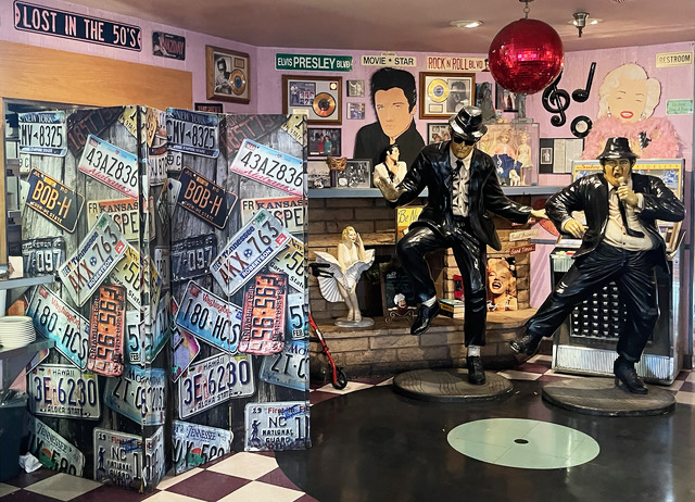 Blues Brothers & More: The Blues Brothers are featured in one area of the diner along with an assortment of license plates from almost every state in the country. On the wall is a small sampling of what diners will see as they walk about the space and view photos and posters covering the walls. Photo by Gary Warren/ladailypost.com