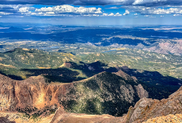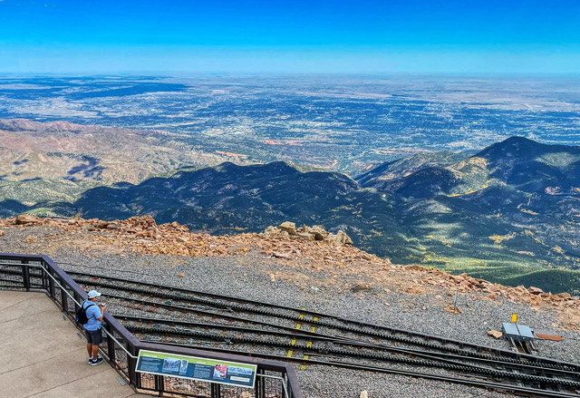 The summit of any of the Colorado 14ers (mountains above 14,000 feet) will offer spectacular views of the surrounding area. Pikes Peak is a special summit as it sits on the front range of the Rockies and offers views toward the plains and fields to the east as well as nice views of Colorado Springs. It also has mountain views in all other directions, which are breathtaking. If you have a chance to visit the summit of Pikes Peak, it will never disappoint, whether you hike, bike, take the train, or drive the road. Watch the weather forecast and try to make the trip on a nice day and the experience will be spectacular!