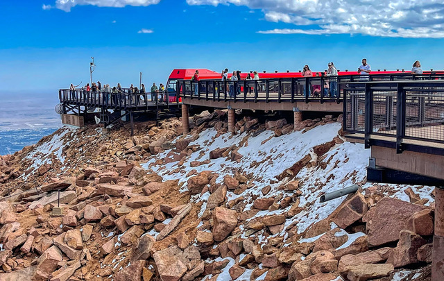 Viewing Deck & Train: Passengers pause to enjoy their first views from the summit of Pikes Peak after stepping out of the bright red train cars. A bit of snow from an early snowfall a few days before we rode the train remained on the ground in shady areas. Photo by Gary Warren/ladailypost.com