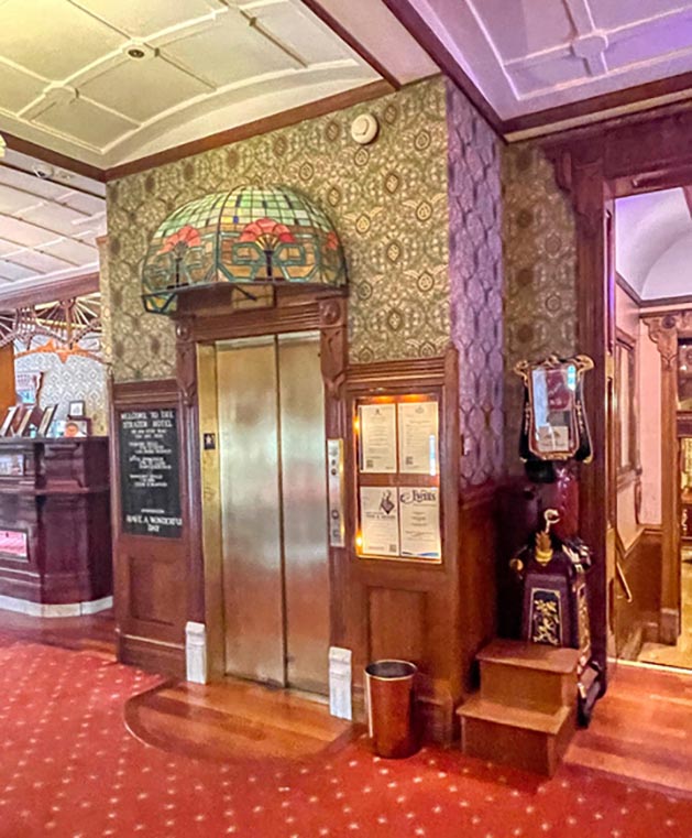 Lobby Elevator: The lobby elevator with brass doors and a stained glass canopy will make you stop and look twice. Again the ornate Victorian decor surrounds the area throughout the lobby. Photo by Gary Warren/ladailypost.com