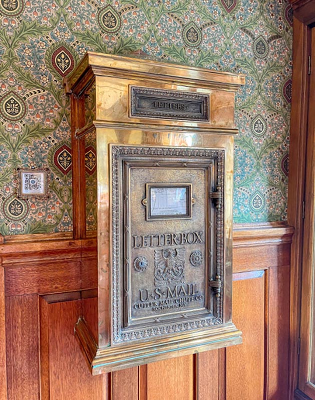 Brass Letter Box: A brass letter box (mailbox) is mounted on the lobby wall near the entrance area. This antique letter box is still in use today by patrons of the hotel. This is an example of the antiques seen all around the hotel. Photo by Gary Warren/ladailypost.com