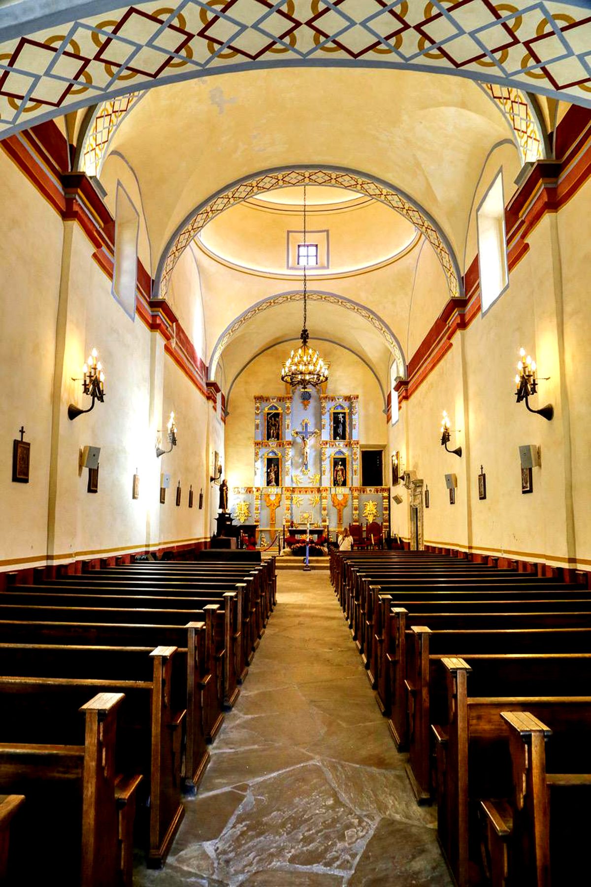 San Jose Interior: A view of the interior of the San Jose Mission church is seen from the entrance area. The painted details accentuate the interior of this beautiful structure. Photo by Gary Warren/ladailypost.com